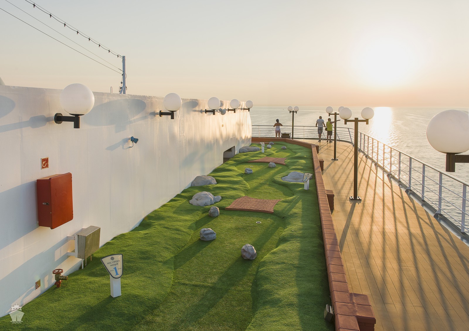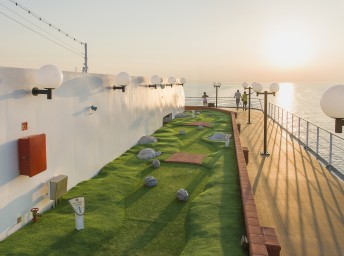 Šport: fitness centerum, minigolf, 2 bazény, detský bazén, bežecká dráha, stolová hra shuffleboard