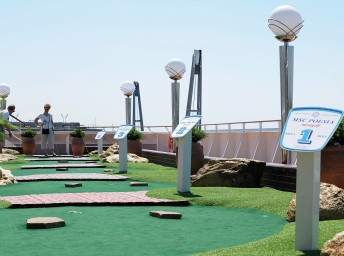 Šport: fitness centerum, 2 bazény, detský bazén, multifunkčné ihrisko, bežecká dráha, minigolf, stolová hra shuffelboard