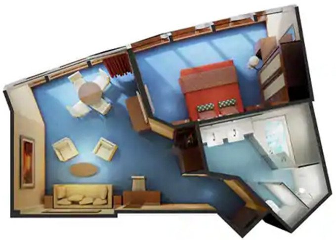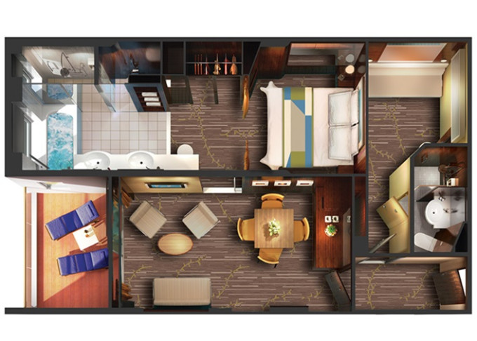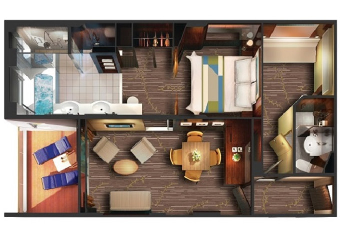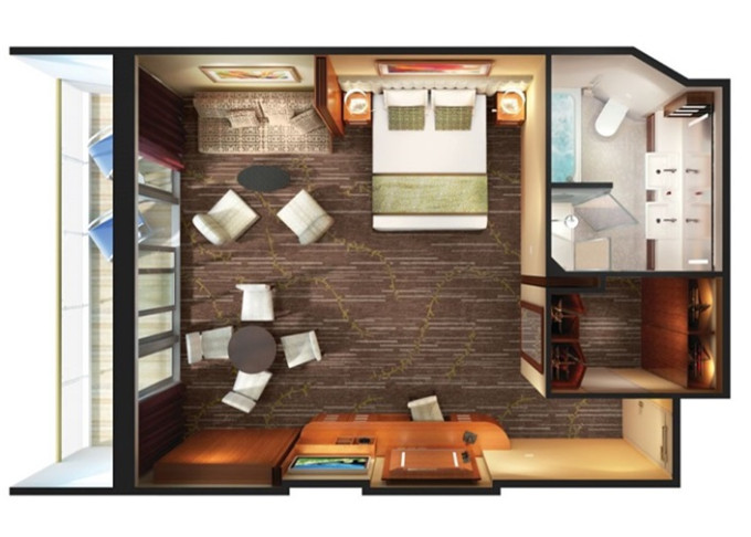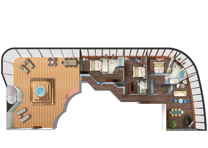 S6 - Deluxe Owner's Suite 61-68 m². Celoplošné neotvárateľné okná. 12. paluba - vpredu. Max 4-6 osôb. Výhody Suite. | 16 814 € 8 407 € za osobu |