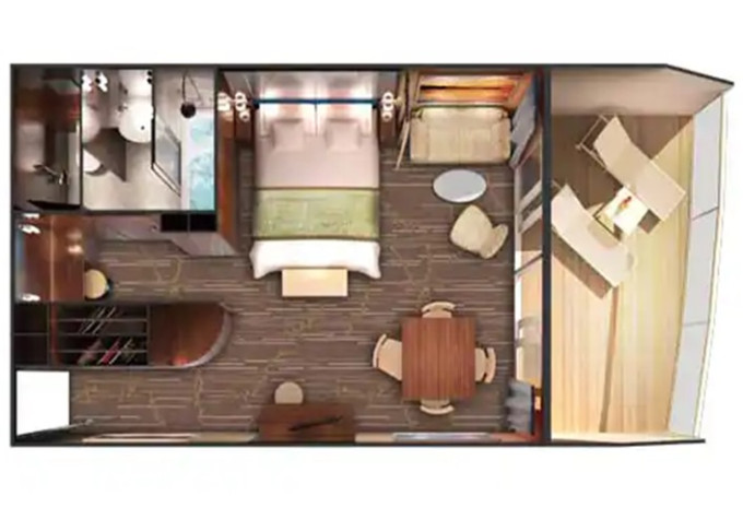 SD - Forward-facing Deluxe Penthouse 47 m² / balkón 12 m². 10. paluba - vpredu. Max 4 osoby. Výhody Suite. | 14 474 € 7 237 € za osobu |