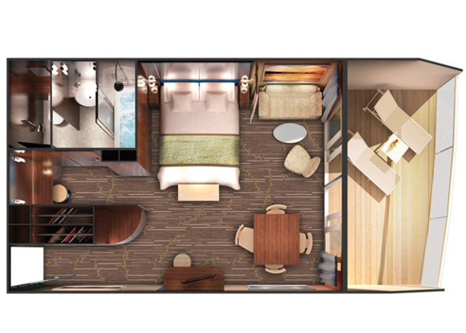 S3 - Owners Suite 66 m² / balkón 13 m². 9. paluba - vpredu. Max 4 osoby. Výhody Suite. | 16 180 € 8 090 € za osobu |