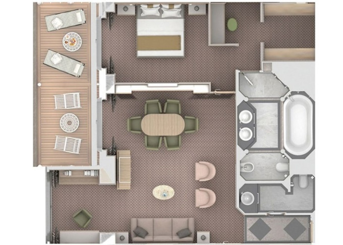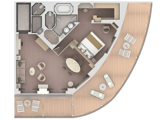 O1 - Owner's Suite 1 88 - 98 m² (vrátane balkóna 12 m²). 9. paluba - stred. Max 3 osoby. | 25 600 € 12 800 € za osobu |