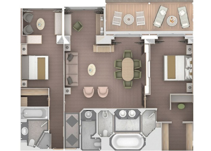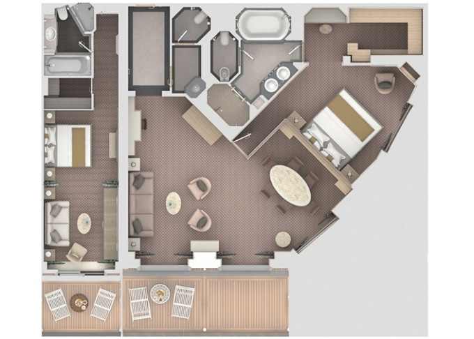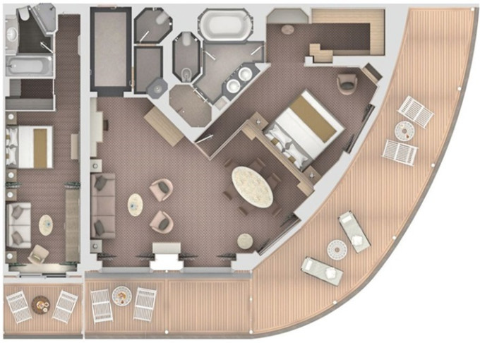 O2 - Owner's Suite 2 119 - 129 m² (vrátane balkóna 12 m²). Owners Suite S1 spojená s Panorama Suite PA 9. paluba - stred. Max 5 osôb. | 39 000 € 19 500 € za osobu |