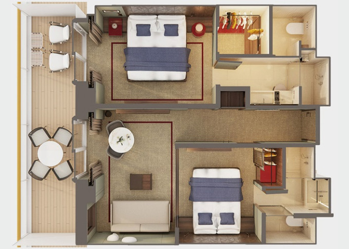 SH - Suite s veľkým balkónom Aft-Facing 58 m² / balkón 34 m². 9. paluba - vzadu. Max 4 osoby. Výhody Suite. | 5 916 € 2 958 € za osobu |
