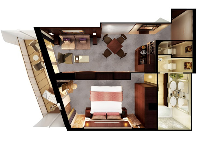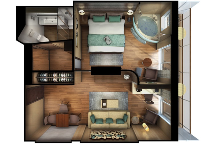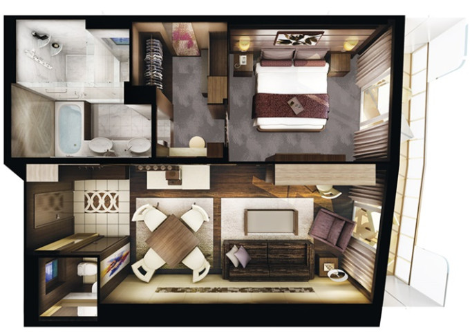M1 - Club Suite Aft-facing 47 m² / balkón 19 m². 10. paluba - vzadu. Max 2 osoby. Výhody Club. | 4 214 € 2 107 € za osobu |