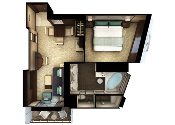 M6 - Club Suite s veľkým balkónom od 30 m² / balkón od 9 m². 8. paluba - vpredu. Max 3 osoby.Výhody Spa. | 3 070 € 1 535 € za osobu |