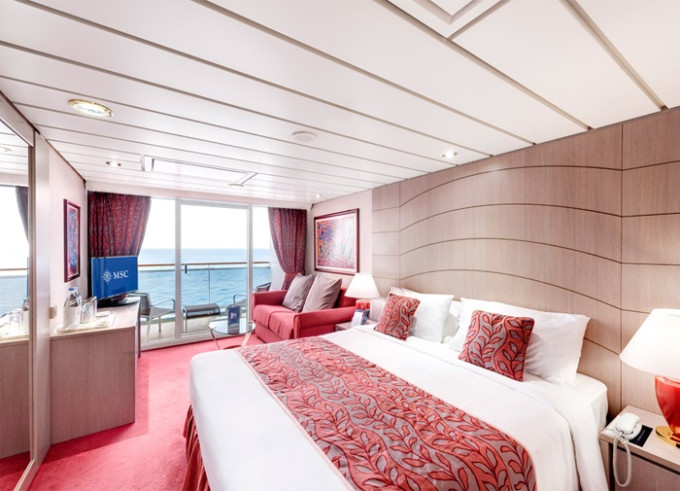 Suite s balkónom: cca 27m² kajuta s manželskou posteľou (na požiadanie 2 oddelené postele) a rozkladacia pohovka. Klimatizácia, kúpeľňa s vaňou, toaletný stolík, priestorná skriňa, TV, telefón, minibar, sejf, sušič na vlasy. Balkón so stolíkom a stoličkami. Internetové pripojenie (za poplatok).