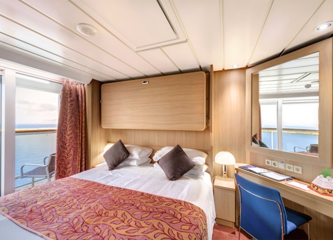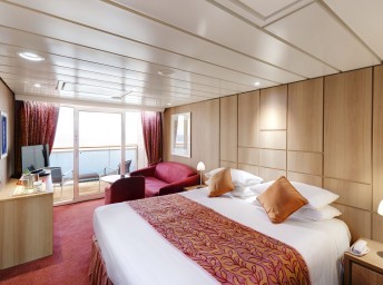 Suite s balkónom: cca 27m² kajuta s manželskou posteľou (na požiadanie 2 oddelené postele) a rozkladacia pohovka. Klimatizácia, kúpeľňa s vaňou, toaletný stolík, priestorná skriňa, TV, telefón, minibar, sejf, sušič na vlasy. Balkón so stolíkom a stoličkami. Internetové pripojenie (za poplatok).