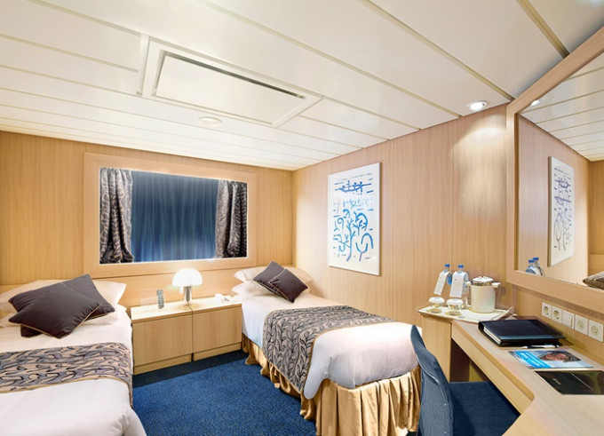 - Ubytovanie v plne vybavenej kajute: vlastná kúpeľňa so sprchou a WC, interaktívna TV, telefón, safe, sušič na vlasy, regulovateľná klimatizácia, minibar (za poplatok). Pripojenie na internet cez Wi-fi (za poplatok)