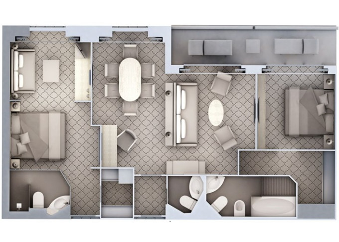 R2 - Royal Suite 2 96 m² (vrátane 2 balkónov 16,5 m² spolu). 6. paluba. Max 6 osôb. | 198 600 € 66 200 € za osobu |
