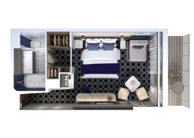 B6 - Kajuta s veľkým balkónom 31 m² / balkón 14 m². 8. paluba - vpredu. Max 4 osoby. 2 352 € 1 176 € za osobu