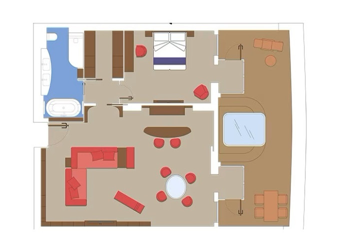 YC4 - MSC Yacht Club Owner's Suite s terasou a s vírivou vaňou 104 m² + balkón s vírivkou 48 m² alebo 78 m² / balkón s vírivkou 65 m². Oddelená obývačka a spálňa, šatník, kúpeľňa s vaňou. Max 4 osoby. 16/18. paluba. Cenový model MSC Yacht Club. | 13 622 € 6 811 € za osobu |