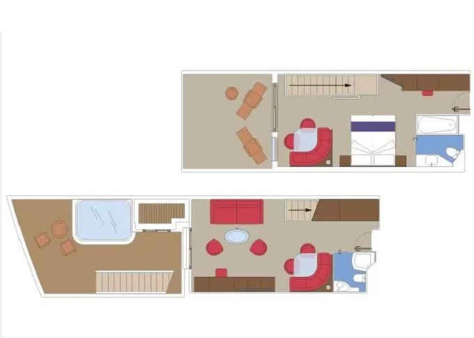 YCD - Yacht Club Duplex Suite 46 m² + balkón 6 m². 2 podlažia, 2 kúpeľne (1 s vaňou) Max 4 osoby. 16. paluba. Cenový model MSC Yacht Club. | 6 750 € 6 750 € za osobu | ||