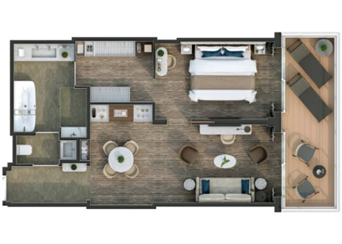 MS - Master Suite 67-77 m² (vrátane terasy 22-32 m²), Spálňa, oddelená obývacia a jedálenská časť. 6. až 9. paluba vzadu. Max 3 osoby. 59 200 € 59 200 € za osobu