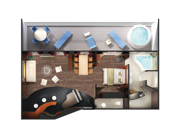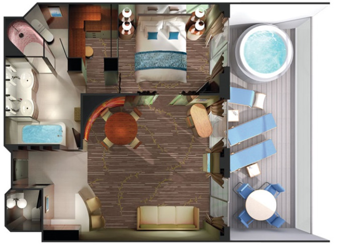 S5 - Deluxe Owner's Suite 128 m² / balkón 45 m². 12. paluba - vpredu. Max 4 osoby. Výhody Suite. | 11 822 € 5 911 € za osobu |