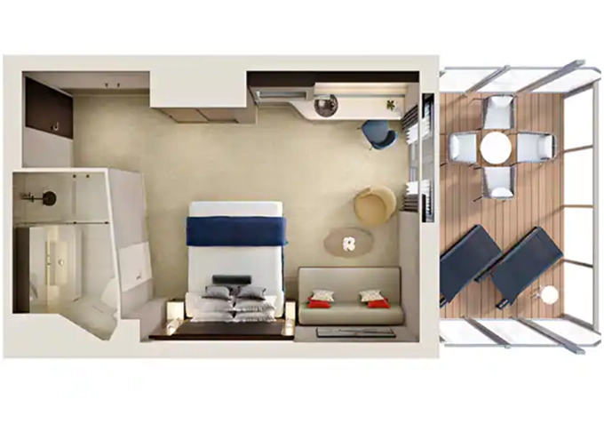 B1 - Kajuta s veľkým balkónom Aft-facing 21 m² / balkón 8 m². 7. až 10. paluba - vzadu. Max 3 osoby. | 6 466 € 3 233 € za osobu |