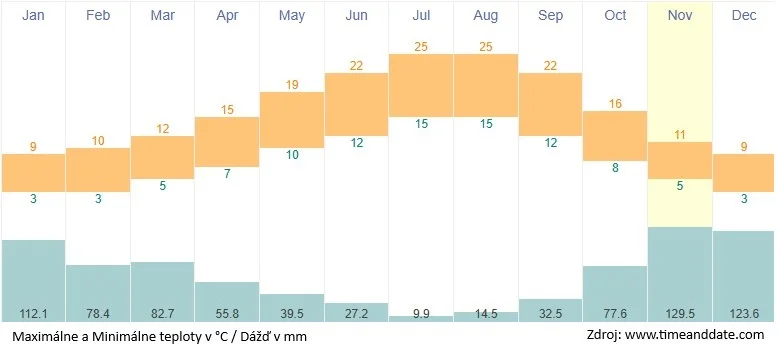 Podnebie je sub-oceánske, s miernymi, daždivými zimami a miernymi, dostatočne slnečnými letami.